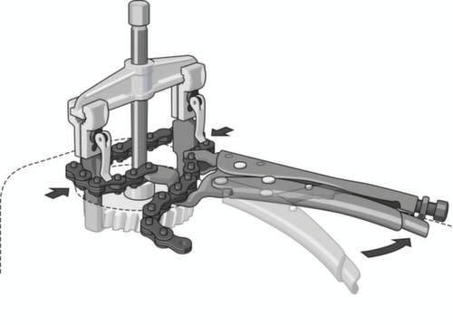 "longDescription": "Met Nr. 136 K-105 kunnen de haken van diverse trekkers worden vastgeklemd en met de ketting worden vastgezet nadat ze op het af te trekken onderdeel zijn vastgezet. Dit voorkomt dat de haken naar buiten buigen en wegglijden. Trekken is ook mogelijk met een zeer klein contactoppervlak van de haken.<br>",