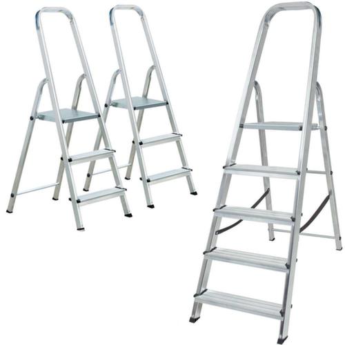 "metaDescription": "3 trapladders in voordelige set - 2x3treden/1x5treden, eenzijdig, aluminium",