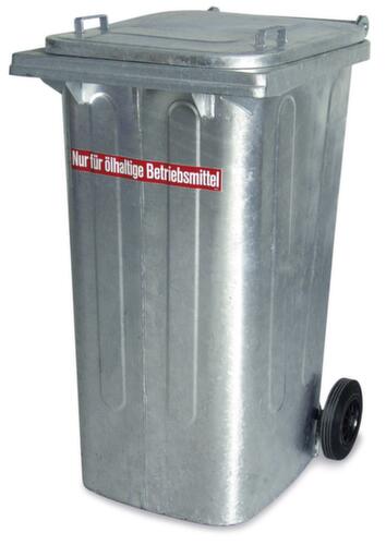 "metaDescription": "Afvalton van plaatstaal oliedicht en brandveilig - vuurverzinkt, 2 massief rubberen wielen",