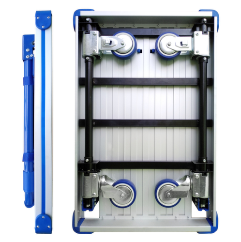 "description": "in-/uitklapb., draagverm. 150kg, laadvl. LxB 630x400mm, aluminiumplaat, in-/uitklapbaar, 2zwenk-/2bokwielen, TPE-banden",
