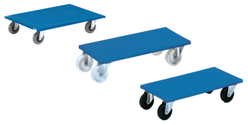 "description": "draagverm. 250kg, laadvl. LxB 600x300mm, Multiplexplaat, blauw, 4zwenkwielen, massief rubber-banden",