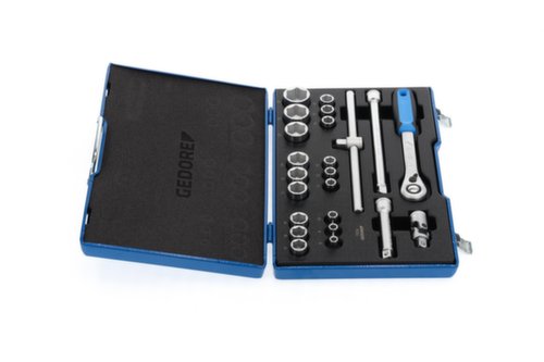 "longDescription": "Avec douilles forgées, trempées, à commande manuelle, profil UD 6 pans (No. 19) ou profil UD 12 pans (No. D 19), Avec outils de commande en acier au vanadium 31CrV3, Assortiment U-20 avec cliquet réversible à levier robuste, avec déclenchement par bouton-poussoir, Assortiment U-3 avec cliquet réversible à denture extra-fine, En coffret en tôle d'acier bleue GEDORE, Dimensions : 425 x 277 x 55 mm<br>",