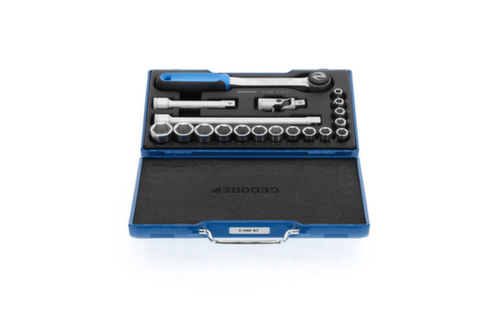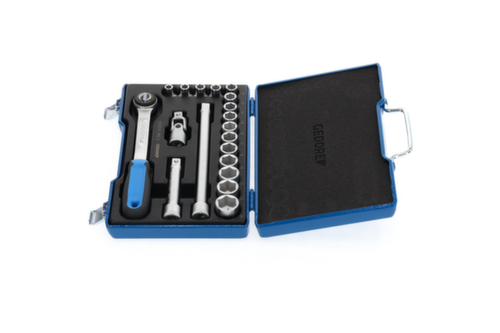 "longDescription": "Avec douilles forgées, trempées, à commande manuelle, profil UD 6 pans (No. 19) ou profil UD 12 pans (No. D 19), Avec outils de commande en acier au vanadium 31CrV3, Avec cliquet réversible à denture extra-fine, Dans coffret en tôle d'acier bleue GEDORE, Dimensions : 320 x 210 x 55 mm<br>",