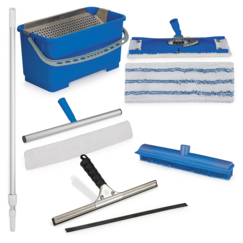 "longDescription": "<h2>DÉPOSE</h2><p>Le système de nettoyage des fenêtres et des sols contient tous les ustensiles de nettoyage importants nécessaires à un nettoyage professionnel des fenêtres et des sols. La tige télescopique en aluminium est extensible jusqu'à 2 mètres, ce qui permet une position ergonomique lors du nettoyage des sols et des fenêtres. La tige se fixe facilement à tous les accessoires grâce à un filetage. Pour le nettoyage des sols, le système de nettoyage comprend un balai en caoutchouc et un support de balai. Le balai en caoutchouc est utilisable à sec et à l'eau, il permet de balayer, de nettoyer et de sécher différentes surfaces comme les tapis, les carrelages, les parquets et même l'extérieur. Le support de la serpillière du système de nettoyage est en polypropylène solide, l'articulation pivotant à 360 degrés permet de nettoyer même les endroits difficiles d'accès sous les groupes de sièges ou dans les coins. La serpillière hygiénique en microfibres peut être lavée, ce qui lui confère une durée de vie particulièrement longue. Une autre serpillière de rechange est également disponible. Pour un nettoyage efficace des vitres, le système de nettoyage des vitres et des sols comprend un lave-vaisselle avec une housse en coton. Grâce aux fibres de coton douces, les surfaces en verre sensibles ne sont pas rayées. La housse en coton est également lavable et une housse supplémentaire peut être commandée à tout moment. La raclette robuste en acier permet de sécher chaque fenêtre sans laisser de traces. La raclette existe en 3 largeurs, elle est par exemple aussi utilisable dans les cabines de douche. Le caoutchouc peut être facilement remplacé, des caoutchoucs de rechange sont également disponibles. Pour le seau en plastique stable d'une capacité de 22 litres, il est possible de commander un support d'égouttage pour le lave-vitre et la raclette, ce qui facilite encore le nettoyage des vitres. Les éléments suivants sont disponibles : - Tige télescopique stable : en aluminium. Longueur extensible de 1 à 2 m. - Support de serpillière : en polypropylène, y compris serpillière en microfibres. Articulation pivotant sur 360°. - Mop : dimensions : 12x35 cm. - Lave-mains : largeur 45 cm. Laveur avec housse en coton. - Housse pour le lave-vaisselle : coton, largeur 45 cm. - Balai en caoutchouc : Peut être utilisé à sec ou mouillé. - Raclette : 3 largeurs disponibles : 25, 35 ou 45 cm. Matériau : acier avec caoutchouc interchangeable. - Caoutchouc pour raclette largeur 25 cm, 35 cm ou 45 cm. - Seau : De forme rectangulaire. Volume : 22 l. Dimensions : 49 x 24 x 24 cm. Matériau : plastique. - Rangement : Égouttoir pour lave-mains et raclette. Vous trouverez également chez nous des chiffons d'essuyage ainsi que d'autres produits de nettoyage pour les besoins professionnels.</p><br>",