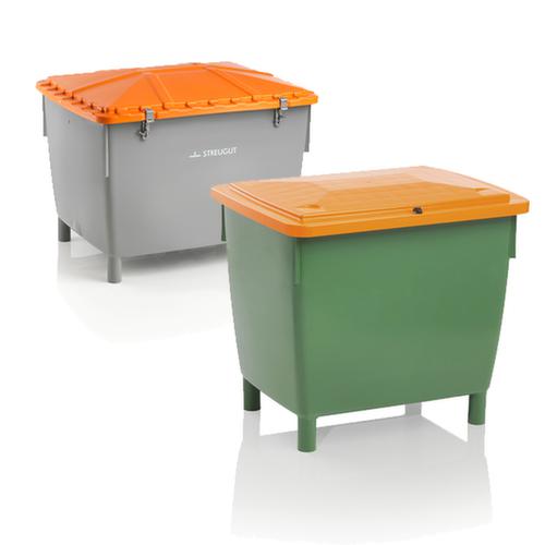 "description": "400l, HxlxP 930x968x776mm, HDPE, gris, couvercle orange, parois plein, pieds, à manutentionner",