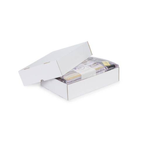 Le carton renforcé à couvercle coiffant est d'utilisation très variable et convient particulièrement aux produits conformes à la norme DIN A3. Le carton se compose d'un fond et d'un couvercle assorti et s'adapte ainsi de manière particulièrement flexible aux différentes hauteurs de remplissage. Le couvercle extérieur blanc donne à l'emballage un aspect particulièrement qualitatif - vos envois de marchandises et produits imprimés sont ainsi présentés de manière attrayante. - Montage simple et rapide grâce à la fermeture à oreilles et à emboîtement - Le couvercle extérieur en papier kraft garantit une résistance et une stabilité maximales grâce à un solide tressage de fibres étroitement lié - Gain de place lors du stockage et manipulation simple grâce à la livraison à plat des cartons