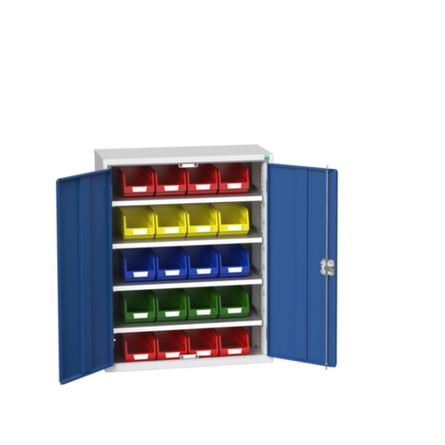 "description": "HxlxP 2000x1050x550mm, corps/face avant RAL7035/RAL5010,21bacs, 6xtablette en acier",