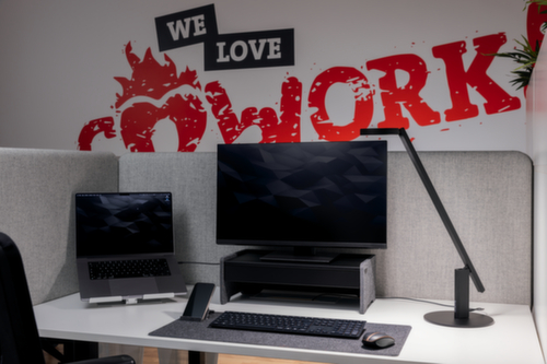 convient pour pour un aménagement ergonomique du travail et une création d'espace. D'une part, grâce au montant, l'ordinateur portable ou l'écran se trouve à une hauteur permettant d'obtenir un angle de vision qui préserve la colonne vertébrale. Le montant libère par ailleurs un espace de rangement supplémentaire sous/autour de l'utilisateur, contribuant ainsi à un espace de travail bien rangé.