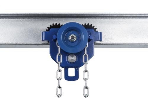 "longDescription": "<h2>Chariot</h2><strong>mouvement simple des charges sur les poutres</strong><br><ul><li><strong>Utilisation en toute sécurité</strong> grâce à la suspension à œillet robuste</li><li><strong>Tôles latérales solides</strong> - 4 éclisses de sécurité contre la rupture des roues, comme nettoyeur de rails et dispositif antichute</li><li><strong>Répartition équilibrée de la charge</strong> sur 4 roues grâce à l'oscillation auto-ajustante autour de l'axe du boulon</li><li><strong>Grande plage de réglage</strong> grâce au remplacement facile des bagues d'écartement</li><li><strong>Durable et silencieux</strong> - roulements à billes de haute qualité à lubrification permanente avec joints d'étanchéité dans les roues</li><li><strong>Roulement régulier sur toutes formes de support</strong> - roues bombées en acier moulé très résistant, dotées de flasques élevés</li><li><strong>Anticorrosion</strong> - chaînes à main galvanisées, boîtier laqué</li></ul><br><h3>Le choix vous appartient :</h3><ul><li><strong>Mouvement par pression ou traction de la charge</strong> - au choix comme chariot porte-palans manuel ou chariot porte-palans à chaîne à tourniquet</li></ul>",