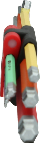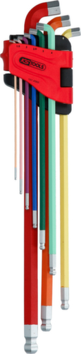 "longDescription": "Version extra longue avec côté court coudé à 108°, avec extrémité à bille à l'extrémité longue, idéale pour les vis difficiles d'accès, chaque taille de clé avec code couleur, trempée de part en part, chromée mate, dans un support à charnière robuste, acier à outils spécial.<br>",