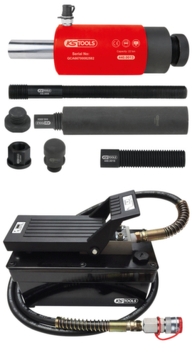 "longDescription": "<ul><li class=\"liste\">pour le montage et le démontage de silentblocs, de pivots de fusée, de douilles de fourche de traction, de roulements de roue, etc.</li><li class=\"liste\">convient aussi bien pour les applications de compression que de traction</li><li class=\"liste\">avec adaptateur de centrage magnétique</li><li class=\"liste\">avec corps de frappe à visser</li><li class=\"liste\">développement de force extrêmement élevé et régulier</li><li class=\"liste\">avec pompe hydraulique pneumatique</li><li class=\"liste\">utilisation universelle avec des réductions M10 - M22</li><li class=\"liste\">avec retour automatique du piston</li><li class=\"liste\">acier à outils spécial</li><li class=\"liste\">dans un coffret robuste en tôle d'acier</li></ul><br>",