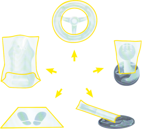 "longDescription": "Protection optimale de l'intérieur des véhicules des clients, manipulation facile et bon ajustement grâce à la bande élastique, set de 5 pièces emballé dans un polybag pratique, protections de l'espace pour les pieds en matériau robuste avec revêtement, protections du siège, du volant, du pommeau de vitesse et du levier de frein à main en film robuste jetable.<br>",