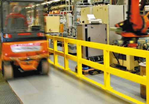 "longDescription": "<h2>Rambarde de protection anticollision</h2><strong>protège les personnes, les stocks et les zones de travail</strong><br><ul><li><strong>Assemblage personnalisé</strong> de poteaux individuels jusqu'à la rambarde complète</li><li><strong>Sépare clairement les zones de travail des voies de circulation</strong> - p. ex pour la circulation de gerbeurs dans l'entrepôt</li><li><strong>Effet de signalisation</strong> - avec revêtement plastique jaune</li><li><strong>Réduit le risque de blessures</strong> - pas d'éclisses ni de vis saillantes</li></ul><br>Le choix vous appartient :<br><strong>Montant</strong> comme montant de départ/d'extrémité, montant central ou montant d'angle<br><ul><li><strong>Poutre transversale</strong> - dans différentes longueurs</li><li>Résistant aux intempéries - galvanisé à chaud en plus pour une utilisation en extérieur.</li></ul>",