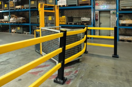 "longDescription": "<h2>Système de garde-corps de protection contre les chocs</h2><strong>Protection contre le renversement</strong><br><ul><li>En acier, pour l'intérieur avec revêtement plastique, pour l'extérieur galvanisé à chaud et en plus avec revêtement plastique en jaune.</li><li>Épaisseur de la paroi 3 mm</li><li>Avec plaque de base pour le chevillage</li></ul>",