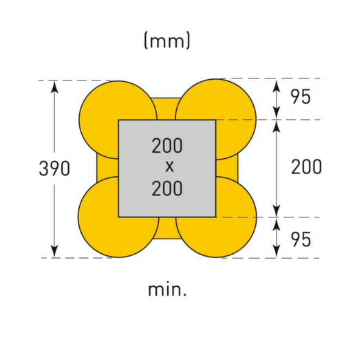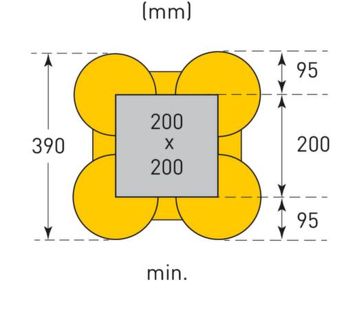 principales dimensions du Moravia système de protection anticollision MORION ECO en un coup d'œil :La structure flexible permet une adaptation sans problème à différentes tailles de colonne. Il suffit pour cela de découper les traverses sur place dans la longueur souhaitée. La graduation par pas de 50 mm facilite l'installation. en polyéthylène résistant aux chocs, coloris jaune. Pour la fixation, les quatre côtés sont insérés les uns dans les autres puis vissés - un ancrage au sol ou sur la colonne n'est pas nécessaire.