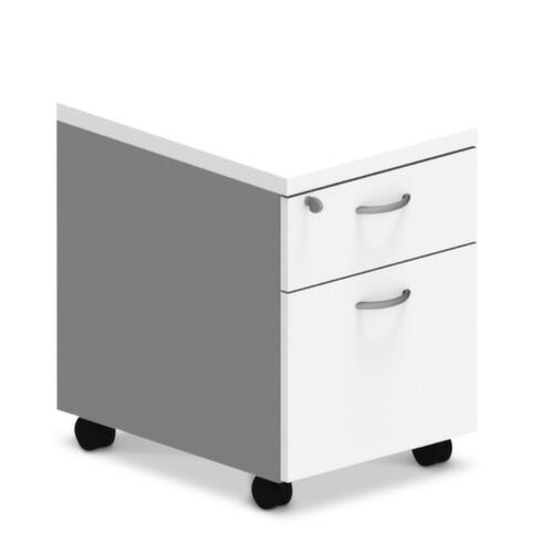 "description": "HxlxP 580x420x560mm, 1 tiroir(s), 1tiroirs p. dossiers susp., verrouil. centralisé, corps blanc, face avant chêne, roulettes",