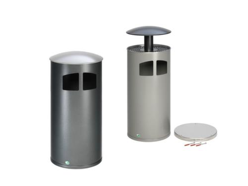 "description": "HxØ 1110x445mm, poubelle capacité 75l, à cheviller, corps acier argent antique, forme de colonne, a. toit protec.",