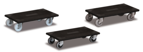 "description": "force 300kg, plateau Lxl 600x350mm, H charge 145mm, plateforme plein, contreplaquépanneau, avec revêtement en caoutchouc, structure coloris noir, 4 roulettes pivotantes, bandage TPE",