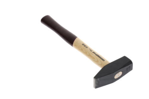 "longDescription": "Gesmede hamerkop, zwart gelakt, gemaakt van gehard staal, slagvlakken inductief gehard voor hard continu gebruik, ontwerp volgens DIN 1041, permanente markering van DIN, fabrikant en gewicht, veiligheidsafschuining zorgvuldig geslepen tot 45° op spoor en helmstok, dubbel gebogen essenhouten handgreep, gelakt handgreepuiteinde verbetert het gevoel, ringwig fixeert de hamerkop door 360° klemkracht.<br>",