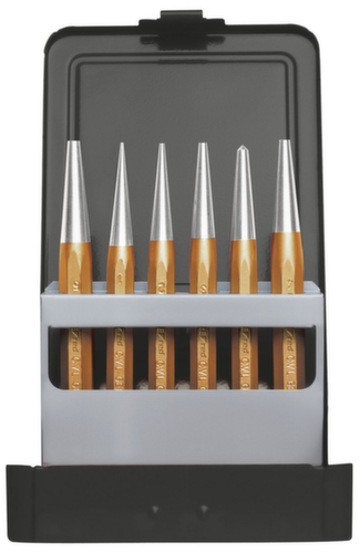 "longDescription": "Uitvoering volgens DIN 6458 en DIN 7250, geharde slagkoppen, koperen schacht, zilvergelakte punt, gemaakt van chroom vanadium staal, in metalen klapkoffer<br>",
