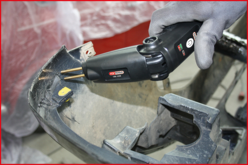 "longDescription": "Geschikt voor het repareren van scheuren of soortgelijke beschadigingen aan kunststof onderdelen (vanaf 1 mm dikte), ook geschikt voor kunststoffen met een glasvezelgehalte van max. 40%, werkt op batterijen, netonafhankelijk, kan ook direct op het stroomnet worden gebruikt, verwarmingsstaafhouder voor verschillende reparatieclips met Ø 0,6 en 0,8 mm, verwarmt de clips met ca. 100 - 200°C, buigbaar en met standaard, één acculading is voldoende voor ca. 150 reparatieclips, met 100 verschillende clips van elk type, reparatieclips worden in de breuk geperst en geven de kunststof carrosserie zijn blijvende stabiliteit terug, inclusief werk-, accustatus- en oplaadindicatie, niet te gebruiken op zuiver GRP of carbon,,Toepassingsgebieden:, bumpers, afdekkingen, betimmeringen, etc. ,<br>",