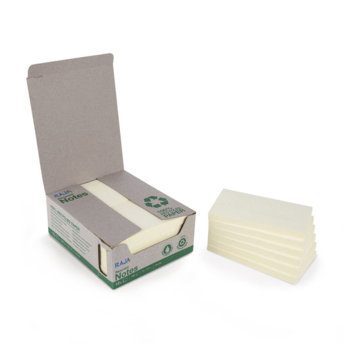 "longDescription": "<h2>Sticky notes RAJA 100% gerecycled, 76 x 127 mm</h2><p>Met onze 100% gerecyclede RAJA-kleefbriefjes kun je snel en gemakkelijk korte berichten schrijven, to-do-lijstjes maken of notities bevestigen. De plakbriefjes hechten op bijna elk oppervlak en elk document. Dankzij de lijm op waterbasis kunnen de plakbriefjes op elk moment worden verwijderd en opnieuw worden gepositioneerd en zijn ze verpakt in een milieuvriendelijke kartonnen doos zonder extra folie. Op deze manier helpen wij en jij de impact op het milieu te verminderen. De pastelgele RAJA sticky notes zijn verkrijgbaar in drie verschillende formaten: 38 x 51 mm, 76 x 76 mm en 76 x 127 mm. Dit betekent dat je de sticky notes voor een grote verscheidenheid aan berichten en notities kunt gebruiken.Alle details in één oogopslag: - Gemaakt van 100% gerecycled materiaal- Herbruikbaar, gemakkelijk te verwijderen- Kleur sticky notes: pastelgeel- Lijm op waterbasis- Pad met 100 pastelgele vellen Om op de sticky notes te schrijven, ben je welkom om een kijkje te nemen in onze diverse selectie van briefpapier. Om pagina's te markeren, raden we ook gekleurde, verwijderbare sticky markers aan voor het labelen en markeren van pagina's.</p><br>",