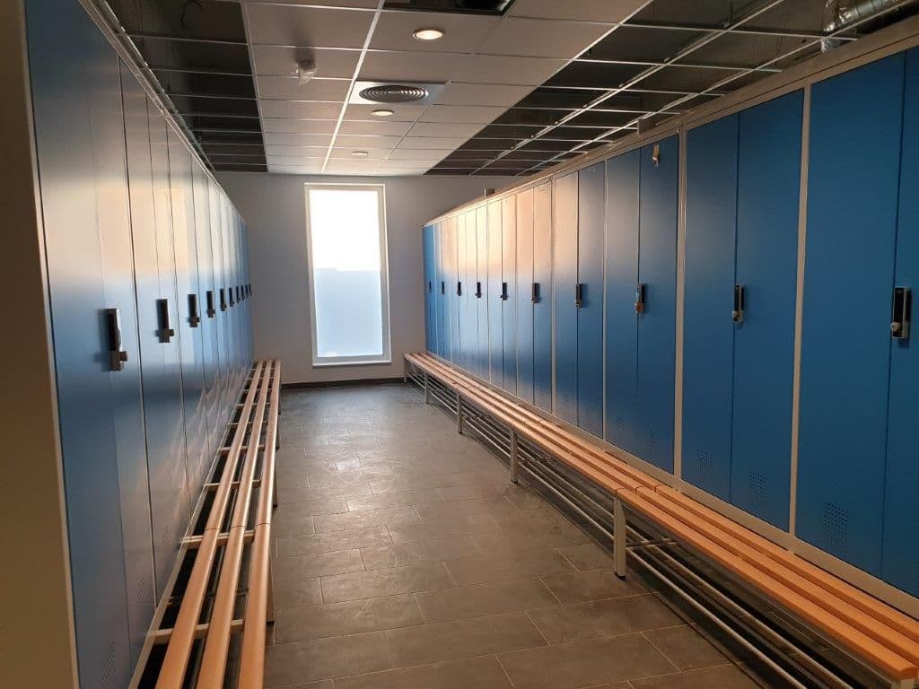 Tijdens het projectoverleg ter plaatse werd samen met de adviseur van UDO BÄR de volgende productoplossing gedefinieerd: 97 garderobekasten met bankje en schoenenrek eronder. Elke kleerkast heeft 2 compartimenten van 400 mm elk naast elkaar met gezamenlijk afsluitbare deuren, met tussenschot in het midden, doorlopende hoedenplank en kledingstang met 3 verschuifbare haken. Speciale uitrusting: elektronisch vergrendelingssysteem, schuine daken met plaatkleppen ( ventilatiesysteem).
