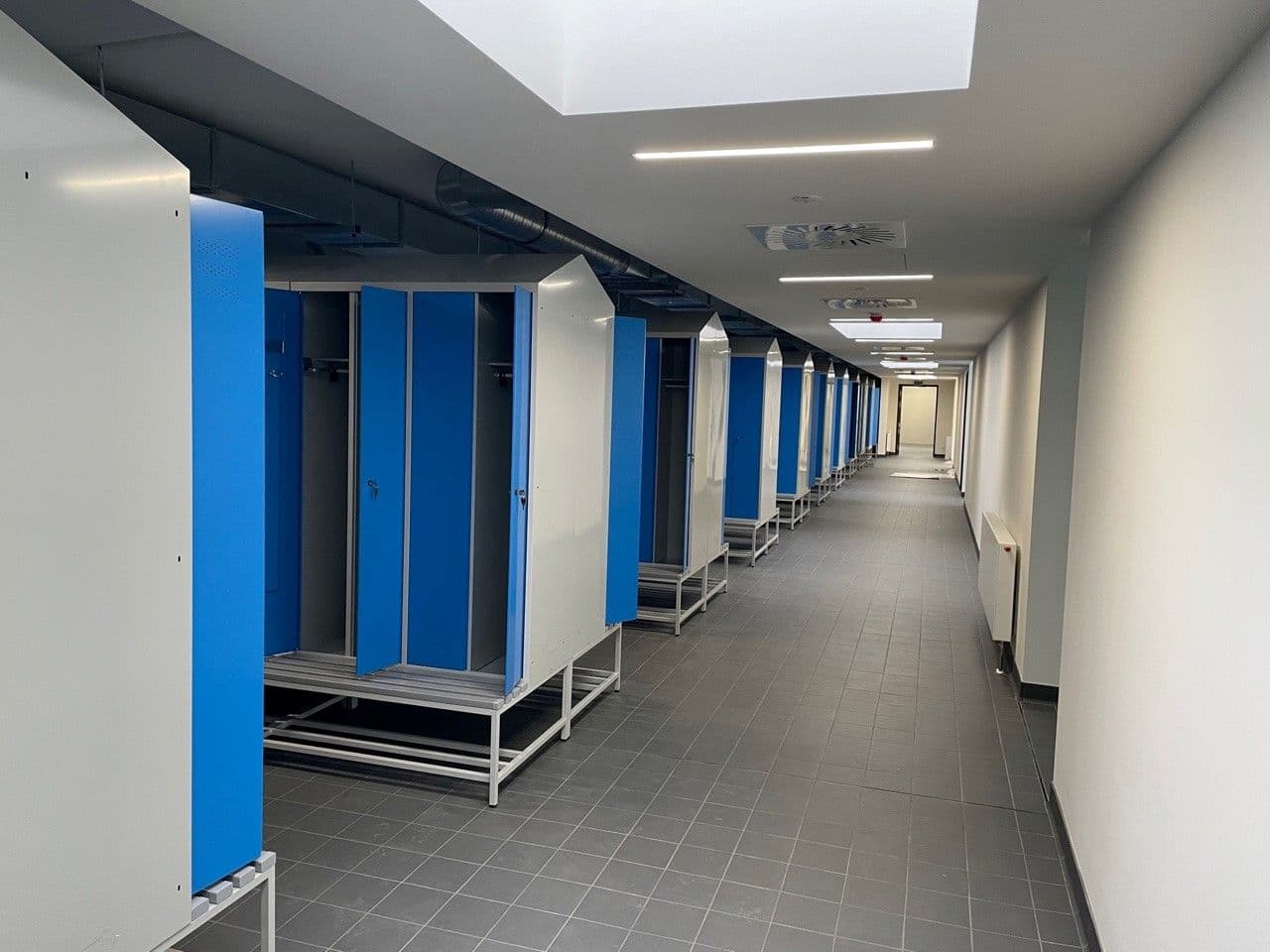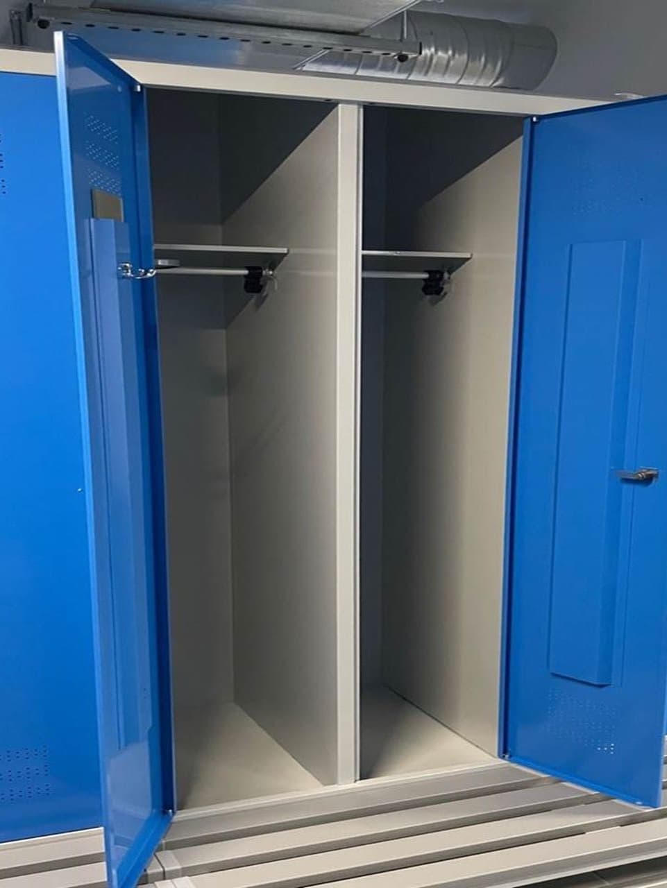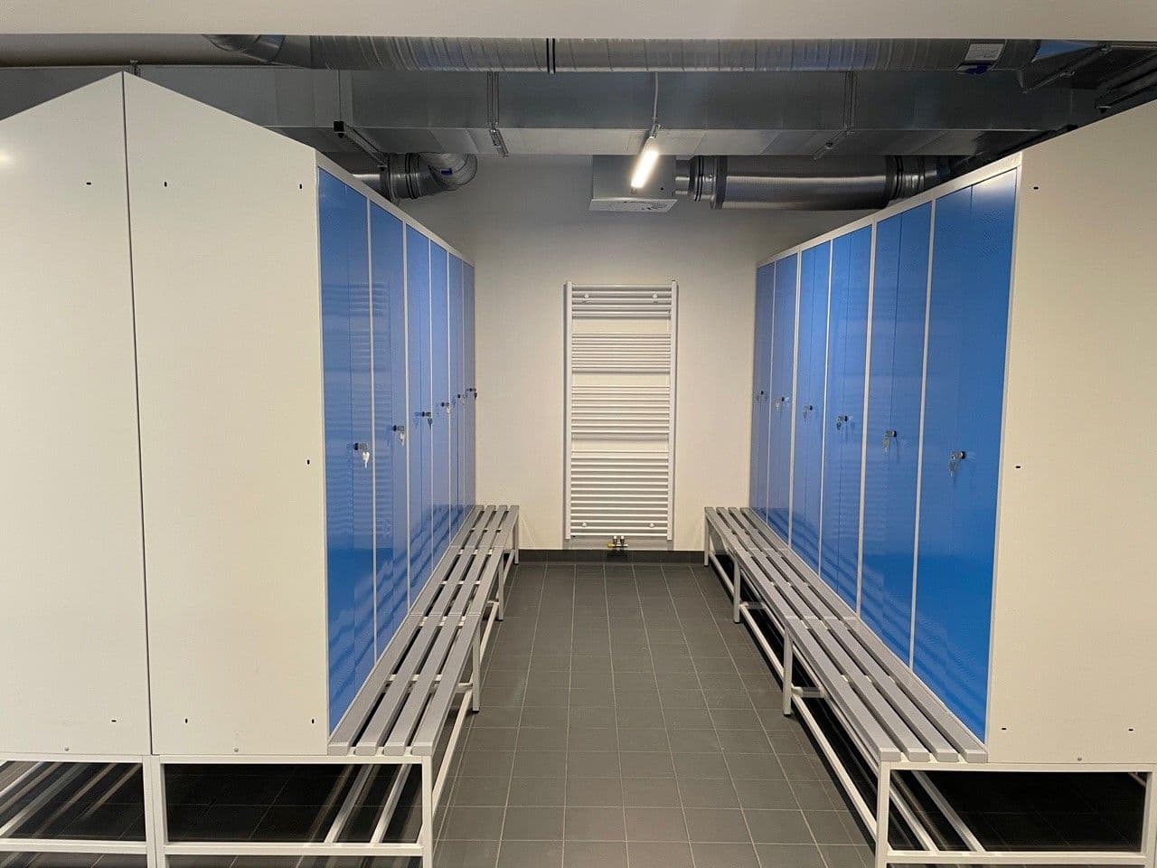 91 Garderobekasten met 4 vakken voor 182 MA in speciale uitvoering: met schuin dak, zitbank, sluitsysteem en binneninrichting.