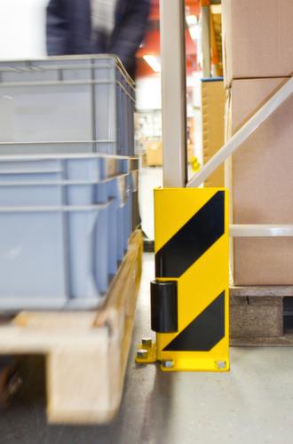 "metaDescription": "Moravia Aanrijdbeveiliging met geleiderol - H 400 mm, hoek- of U-profiel, staal, geel/zwart",