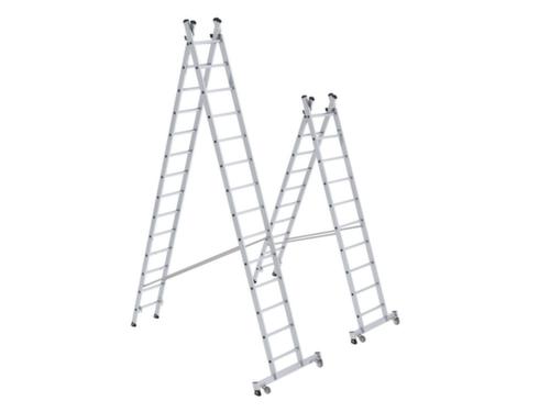 "longDescription": "<h2>Multifunctionele combiladder</h2><strong>extra veilig dankzij de nivello® dwarsbalk</strong><br><ul><li>Universeel inzetbaar - als enkele ladder, trapladder en uitschuifbare ladder</li><li>Opstijgen en afdalen zonder ongelukken - sporten met antislip ribbels</li><li>Stabiliteit - met veiligheidsgordels om verspreiding te voorkomen</li><li>Geflensde sport-holm verbindingen</li><li>Duurzaam en licht - staanders van geperste aluminium profielen en stalen beslag</li><li>Extra stabiel - brede nivello®-dwarsbalk voor boutbevestiging en antislip nivello®-ladderschoenen</li></ul><br>Deze multifunctionele ladder van Günzburger Steigtechnik is een echte combiset en een topaanbieding met buitengewone beschermingsmaatregelen en een garantie van 15 jaar. <br><br>Hij is verkrijgbaar in een tweedelige uitvoering, met verschillende aantallen sporten en naar keuze met of zonder transportrollen. Alle versies hebben sterke staanders van geperst aluminium profielen met stevige stalen fittingen en flensverbindingen tussen de staanders. De vierkante sporten zijn voorzien van antislip ribbels, zodat een veilige stand wordt verkregen.<br><br>De multifunctionele ladder kan worden gebruikt als een tweezijdige trapladder en uitschuifbare ladder of als een enkele ladder. Als u kiest voor de ladder met de standaard traverse, is deze bij uitstek geschikt voor stationair gebruik. De oprolbare traverse maakt niet alleen mobiel gebruik en gemakkelijk vervoer mogelijk, maar heeft ook een geïntegreerde automatische anti-liftinrichting op de bovenste ladder. Dit voorkomt dat de ladder per ongeluk opzij of zelfs achterover kantelt wanneer hij als een enkele ladder in een dakgoot wordt gehaakt. Extra bescherming wordt geboden door de twee zeer sterke spangordels, die dienen als anti-spreidbeveiliging. Elke versie van de polyvalente ladder is uitgerust met brede dwarsbalken die tweemaal aan de onderste ladderboomuiteinden zijn vastgebout. Bovendien staan de uiteinden van de ladderbomen op antislip ladderschoenen. Bij de mobiele ladder maken de traverse-rollen, die met de hand in enkele stappen kunnen worden neergeklapt, het mogelijk de ladder op een comfortabele en rugvriendelijke manier van de ene gebruiksplaats naar de andere te verplaatsen.<br><br><strong>Kwaliteitskenmerken!</strong><br><ul><li>kwaliteitsgarantie conform DIN EN 131</li><li>volgens DGUV 208-016 (voorheen BGI 694)</li><li>volgens BetrSichV TBRS 2121</li></ul>",