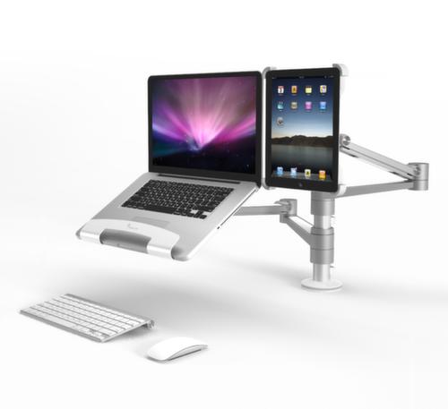 "longDescription": "<h2>Notebookhouder</h2><ul><li>Gemaakt van aluminium, recyclebaar</li><li>Kantelbaar van +90° tot -55°, zwenkbaar van +65° tot -65°, met geïntegreerde zwenkblokkade</li><li>Actieradius 360</li><li>In hoogte verstelbaar met 240 mm</li><li>VESA-systeem met snelsluiting voor eenvoudige montage van het scherm</li><li>Incl. tafelklem voor paneeldiktes tot 40 mm en met doorlopende tafelbevestiging voor paneeldiktes tot 50 mm</li><li>Belastbaar tot 7 kg</li></ul>",