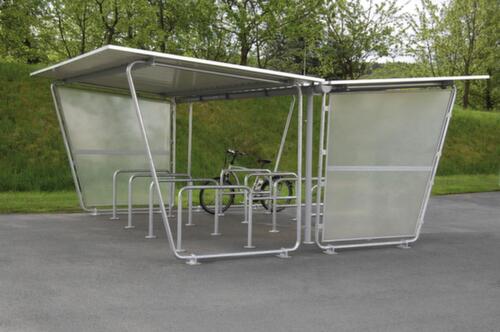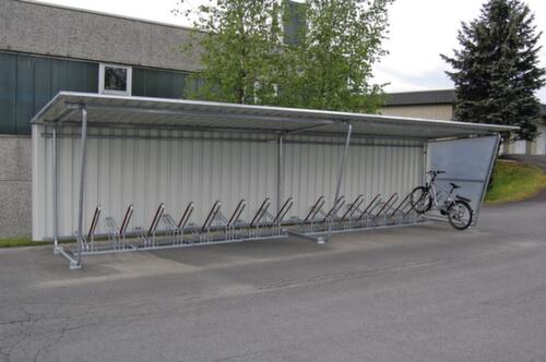 "longDescription": "<h2>Overkapping</h2><strong>beschutting tegen het weer voor fietsen</strong><br><ul><li><strong>altijd uitbreidbaar</strong> dankzij aanbouwelementen</li><li><strong>corrosiewerend</strong> - alle stalen delen zijn verzinkt</li><li><strong>droge parkeerplaats</strong> dankzij lessenaardak van verzinkte trapeziumplaat met coating</li><li><strong>makkelijk zelf te monteren</strong> - inclusief montagehandleiding, bouwtekening, fundamentplan, zonder bevestigingsmateriaal</li></ul><br><h3>Bestel direct:</h3><ul><li><strong>volledig beschermd</strong> - achterwand van verzinkte trapeziumplaat met coating en zijwand van glad, transparant polyester, steunframe van ronde buis en vast te schroeven aansluithoeken</li></ul><br><h3>De keuze is aan jou:</h3><ul><li><strong>voor eenzijdig gebruik</strong> - voor maximaal 12 eenzijdig te plaatsen fietsen</li><li><strong>voor tweezijdig gebruik</strong> - voor maximaal 24 tweezijdig te plaatsen fietsen en dakgoot en regenpijp van pvc</li></ul><br><strong>Levering!</strong><br><ul><li>lossen met heftruck of kraan vereist</li><li>funderingswerkzaamheden ter plaatse</li></ul>",