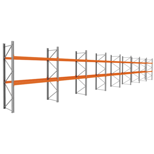 de belangrijkste maten van de palletstelling in één oogopslag:8 stellingvelden met elk 2 niveau(s) met traversen bieden opslagcapaciteit voor in totaal 72 pallets. vakhoogtes zijn afhankelijk van het doel en uw behoeften verstelbaar in stappen van 70 mm. Elk stellingveld biedt 9 palletplaatsen (incl. vloeropslag). opslag in de lengte. de lengteliggers worden met haken met drie klauwen en uitlichtbeveiliging in het staanderframe gehangen. gebruik eenzijdig - ontworpen voor plaatsing tegen een wand. zeer stabiel door steundragers met gesloten kokerprofielen. constructie van staal. staanders met corrosiebeschermende zinklaag. niveaus in RAL2004 zuiver oranje.