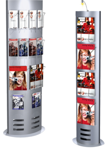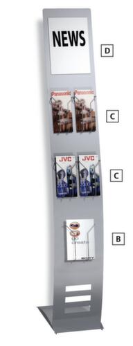 "longDescription": "<h2>Informatiestands</h2><strong>wegwijzer en posterhouder in één</strong><br><ul><li><strong>direct gebruiksklaar</strong> - voorbereid om te bevestigen aan foldervakken en affichevakken</li><li>Stabiel en krasbestendig - frame van staal met poedercoating</li><li><strong>staat stevig</strong> door standvoet van staal</li></ul><br><h3>De keuze is aan jou:</h3><ul><li><strong>meer of minder ruimte</strong> - naar keuze als een- of tweezijdige uitvoering</li></ul><br>De infozuil kan worden gebruikt als wegwijzer, posterhouder voor bedrijfsinformatie en welkomstgroeten en als brochurehouder. Door het dubbelzijdige gebruik kan de zuil ook in het midden van de ruimte worden geplaatst en biedt hij meer ruimte voor uw mededelingen. De stevige stalen constructie is absoluut stabiel en de poedercoating houdt het oppervlak beschermd.<br><br>De brochurevakken kunnen gewoon in het metalen oppervlak worden gestoken, waarin kleine, bijna onzichtbare gaatjes zijn gestanst. De affichevakken van kunststof in kristalglas-look kleven door middel van bijgevoegde magneetstrips. Zo kunt u de informatiezuil aanpassen en de lay-out op elk moment gemakkelijk wijzigen.<br><br><strong>Goed om te weten!</strong><br>Geleverd zonder folder- en affichevakken. Bestel ze direct mee!<br>",