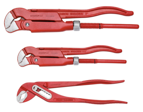 "longDescription": "Pijptang 1.1/2\" en 2\", S-klauw: uitvoering volgens DIN 5234, massieve uitvoering, bekstand onder 45°, tanden tegen de draairichting in, bekken gepolijst, vergrendelbare stelmoer, staal chroom-vanadium, waterpomptang 10\", 7-voudig verstelbaar: uitvoering volgens DIN 8976 Form C, overlangs getande grijpvlakken, met doosscharnier, 7-voudig verstelbaar, kop en scharnier gepolijst, staal chroom-vanadium, poedercoating rood<br>",