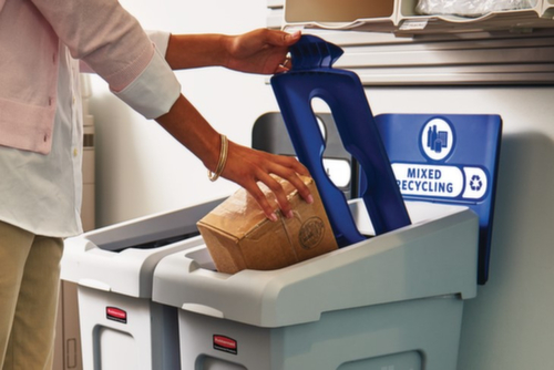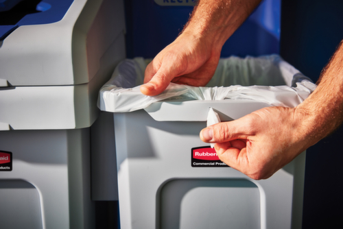 de belangrijkste maten van de Rubbermaid afvalbak Slim Jim® Starter in één oogopslag:vuilniszak-sluiting voor de zakbevestiging. kop van slagvast polyethyleen in grijs. romp van slagvast polyethyleen in grijs. wandconstructie met ventilatiekanaal.