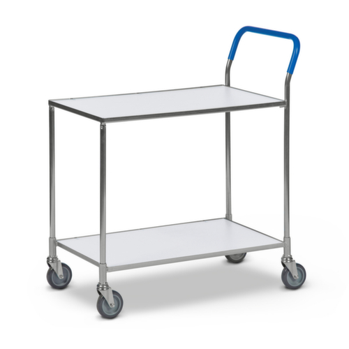 "longDescription": "<h2>Stalen serveerwagen met kunststof handvat</h2><p>De stalen serveerwagen is een praktische hulp in uw bedrijf, of het nu in het magazijn, op kantoor of op de serviceafdeling is. Met zijn robuuste ontwerp en hoge draagvermogen is hij ideaal voor het vervoeren van zware voorwerpen. Serveerwagen met comfortabele handgreep en hoog draagvermogen De met kunststof beklede handgreep zorgt voor een comfortabele en veilige grip, zelfs bij lage temperaturen. Dit betekent dat je niet alleen beschermd bent tegen koude handen, maar ook profiteert van meer gebruiksgemak. De twee niveaus bieden een totaal draagvermogen van 150 kg (75 kg per niveau), zodat zelfs zware ladingen zonder problemen kunnen worden vervoerd. Praktische afmetingen en lichtlopende wielen Met afmetingen van 95 x 43,5 x 85 cm en een afstand van 51 cm tussen de niveaus biedt de serveerwagen voldoende ruimte voor verschillende items. Dankzij de vier kunststof wielen met een diameter van 10 cm is hij gemakkelijk te manoeuvreren, zelfs op oneffen oppervlakken. Stabiliteit en flexibiliteit De serveerwagen is gemaakt van robuust staal en weegt 13,5 kg, waardoor hij extra stabiel is. Ondanks de stevige constructie is hij gemakkelijk te manoeuvreren en flexibel in gebruik dankzij de lichtlopende wielen. Heb je naast de transporthulp ook praktische opbergoplossingen nodig? Bij RAJA vind je verschillende opbergboxen, met en zonder deksel, gekleurd en transparant.</p><br>",