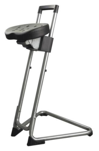 "longDescription": "<h2>Staande hulp</h2><strong>draaibare stoel met automatische terugloop</strong><br><ul><li><strong>ondersteunt een ergonomische houding</strong> zitting kantel- en zwenkbaar</li><li><strong>aan te passen aan de lichaamslengte</strong> door 8 vergrendelposities</li><li>Bijzonder robuuste zitting van PU-schuim met stalen inleg</li><li>Slag- en krasbestendig oppervlak - Frame met poedercoating</li><li>Veilige stand dankzij antislip vloerglijders</li></ul><br>De stahulp voor ontspannen staan waar zitten niet mogelijk is. De zeer stabiele stahulp is geschikt voor personen tot 120 kg, draagt het GS-keurmerk en heeft 5 jaar garantie. De staande stoel ontlast de benen, rugspieren en wervelkolom. Dit komt niet alleen de gezondheid, maar ook de prestaties en productiviteit van uw werknemers ten goede.<br><br>De zithoogte is traploos instelbaar. De zitneiging kan tot 15° worden versteld. Met de extra 16° horizontaal draaibare zitting kan de stahulp optimaal aan de gebruiker en zijn werkgebied worden aangepast. De ergonomisch gevormde comfortzitting van integraalschuim is slijtvast en eenvoudig te reinigen. Het roestvrijstalen frame is bijzonder geschikt voor vochtige ruimtes en werkomgevingen met hoge hygiënenormen. Antislip vloerglijders zorgen voor een veilige stand.<br>",